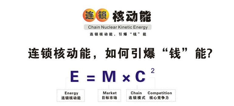 • 廣州采納企業(yè)管理顧問有限公司陳宏創(chuàng)建的連鎖核動能理論 以愛因斯坦的能量公式為基礎(chǔ)創(chuàng)建,其理論意義是: 企業(yè)找準(zhǔn)了目標(biāo)市場,以連鎖的方式經(jīng)營,核心競爭力越大, 推動其發(fā)展能量就越大。